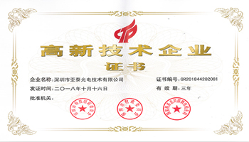 近日,我司收到深圳市科創(chuàng)委、深圳市財政委員會、國家稅務(wù)總局深圳市稅務(wù)局聯(lián)合頒發(fā)的高新技術(shù)企業(yè)證書,標(biāo)志著我司順利通過2018年 “高新技術(shù)企業(yè)”復(fù)審認定。這也是對深圳市亞泰光電技術(shù)有限公司多年來堅持自主研發(fā)、技術(shù)創(chuàng)新、堅持走高新技術(shù)發(fā)展道路的有力肯定。