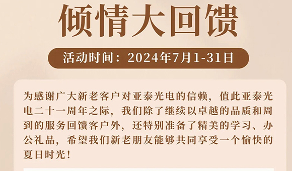 為感謝廣大新老客戶對亞泰光電的信賴,值此亞泰光電二十一周年之際,我們除了繼續以卓越的品質和周到的服務回饋客戶外,還特別準備了精美的學習、辦公禮品,希望我們新老朋友能夠共同享受一個愉快的夏日時光!