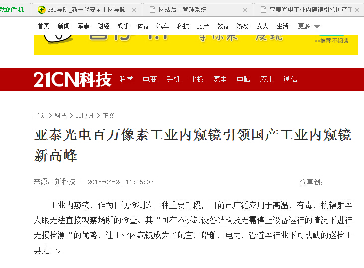 為改變這種局面,作為“國家高新技術企業(yè)”的深圳市亞泰光電技術有限公司,自2009年開始著手對工業(yè)內(nèi)窺鏡的研發(fā)工作,成立了光學事業(yè)部并特別聘請了深圳大學牛憨笨院士作為技術顧問,經(jīng)過不懈的專研與努力,亞泰光電公司不僅擁有了自己的工業(yè)內(nèi)窺鏡產(chǎn)品,并先后獲得了5項工業(yè)內(nèi)窺鏡方面的發(fā)明專利。近日,由亞泰光電自主研發(fā)的“百萬級像素”的超清視頻內(nèi)窺鏡已成功問世,選用國產(chǎn)自主研發(fā)高端產(chǎn)品不再是夢。
