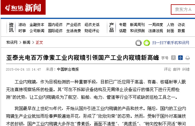 和訊網:亞泰光電工業內窺鏡引領國產工業新高峰
