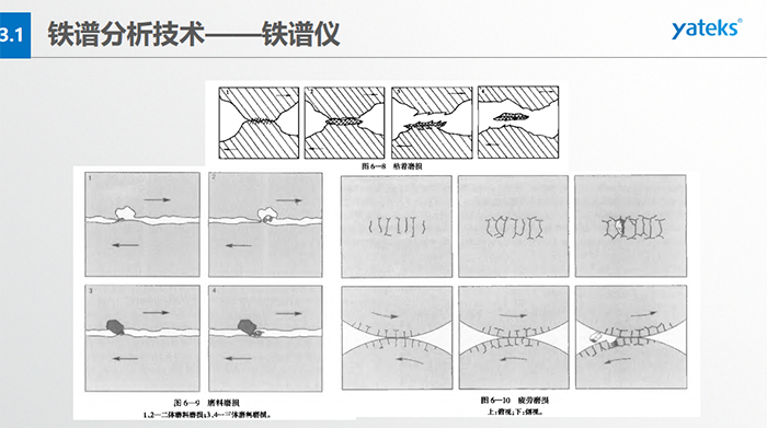 分析式鐵譜儀:利用高梯度磁場(chǎng),將油液中的磨粒分離出來(lái),按規(guī)則排列沉積在鐵譜基片上;借助于顯微鏡,分析磨粒的數(shù)量、 尺寸分布、成分、類型等,進(jìn)而確定設(shè)備磨損的狀況。直讀式鐵譜儀:利用高梯度磁場(chǎng),將油液中的磨粒分離并按大小排列于沉積沉積管; 借助于光密度計(jì),測(cè)定所沉積大小磨粒的濃度,進(jìn)而確定設(shè)備的磨損程度。旋轉(zhuǎn)式鐵譜儀:利用離心力和磁場(chǎng)力聯(lián)合作用, 將油液中的磨粒分離出來(lái),呈輻射線狀按大小排列于鐵譜基片;借助于顯微鏡,分析磨粒的數(shù)量、尺寸、成分、類型等,進(jìn)而確定設(shè)備磨損的狀況。