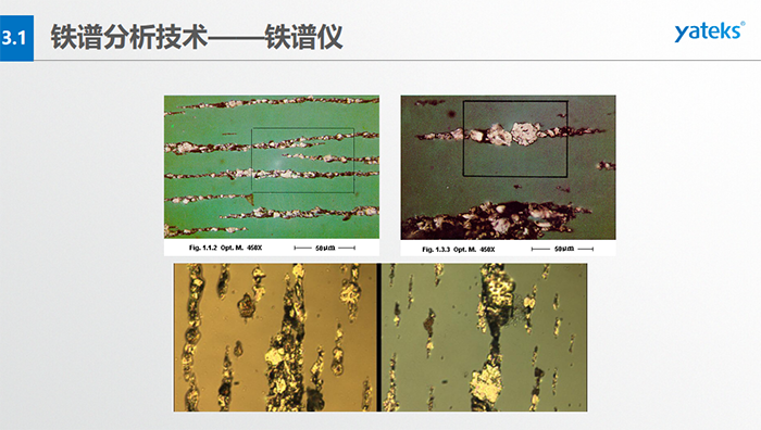 基本概念:檢測(cè)在用油中磨損顆 粒的形 狀、成份、大小和數(shù)量;檢測(cè)方法:磁場(chǎng)沉積、顯微鏡分析判斷。