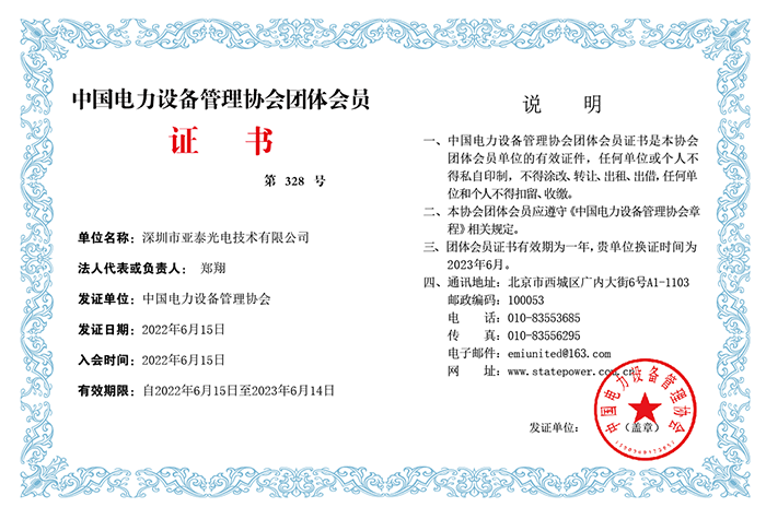 6月15日,深圳市亞泰光電技術(shù)有限公司正式接到中國(guó)電力設(shè)備管理協(xié)會(huì)頒發(fā)的“中國(guó)電力設(shè)備管理協(xié)會(huì)單位會(huì)員證書”,經(jīng)過前期申請(qǐng)、材料評(píng)審等一系列工作,亞泰光電正式成為中國(guó)電力設(shè)備管理協(xié)會(huì)的一員。