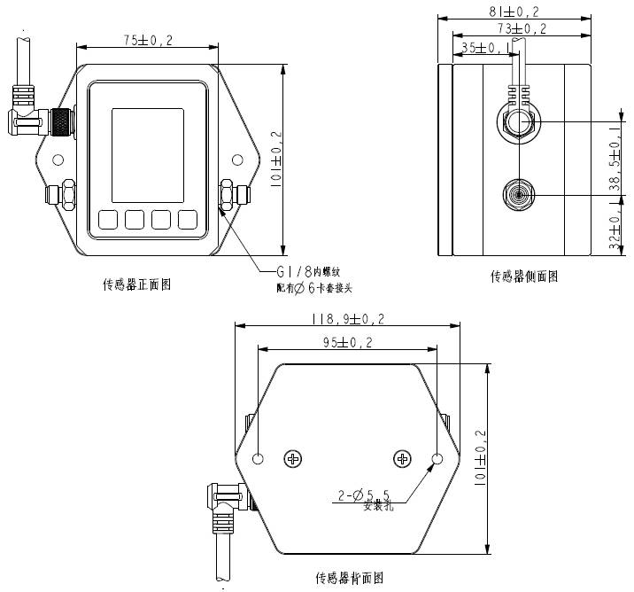 傳感器機箱的外形以及安裝孔尺寸圖 單位:mm